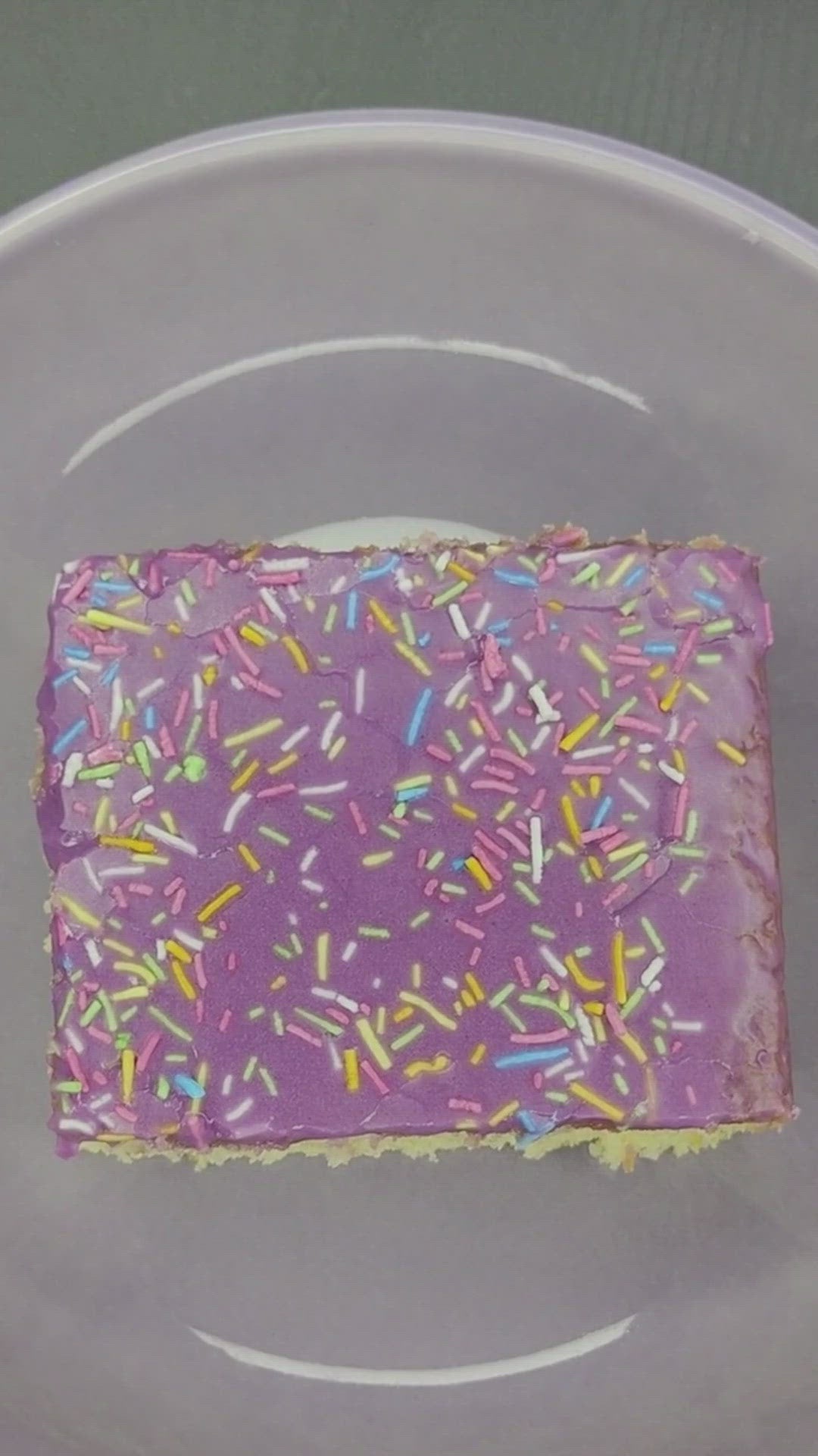Now available at Vanilla Ice Cakes. Our classic vanilla sponge, topped with a layer of purple icing and a generous amount of sprinkles, covered in hot custard!